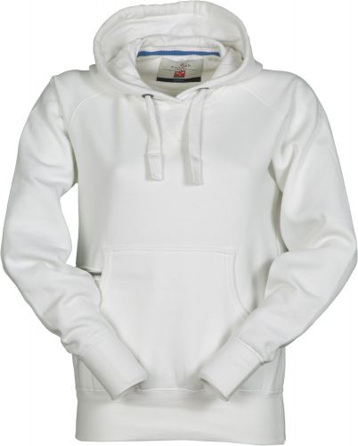 Women’s fitted hoodie with double stitched seams and white drawstring with contrasting stitching and metal rings, raglan sleeves, V-design neck stitching, kangaroo pockets, small zip pocket, stretch rib cuffs and hem, reinforced seams, 300gr/m2. Material 70% bavlna, 30% polyester.