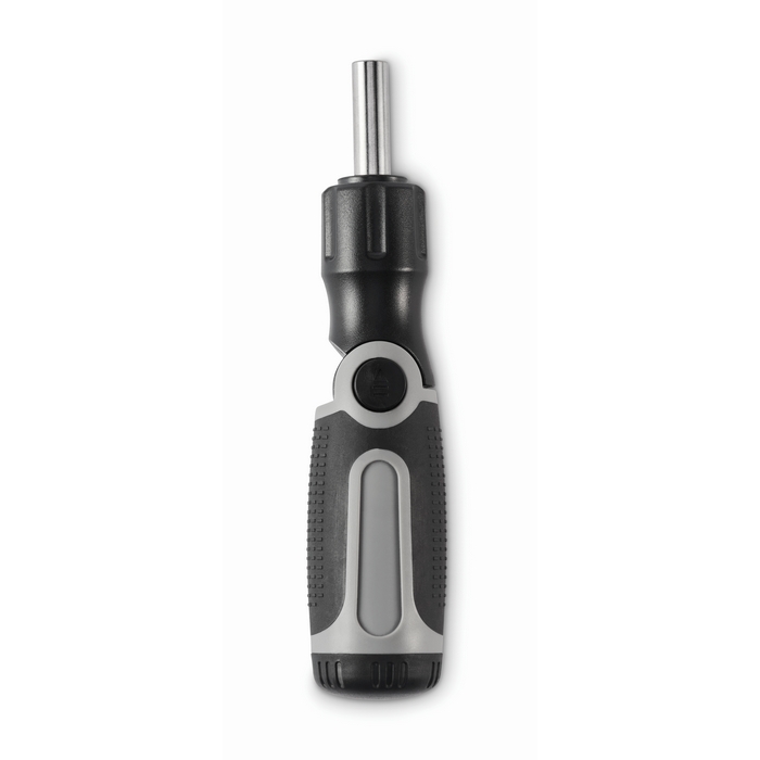 Bendable screwdriver set with ABS handle and 12 iron bits including Phillips, flat head, hex and torx types. Dimensions: 16.7 x 3.3 cm