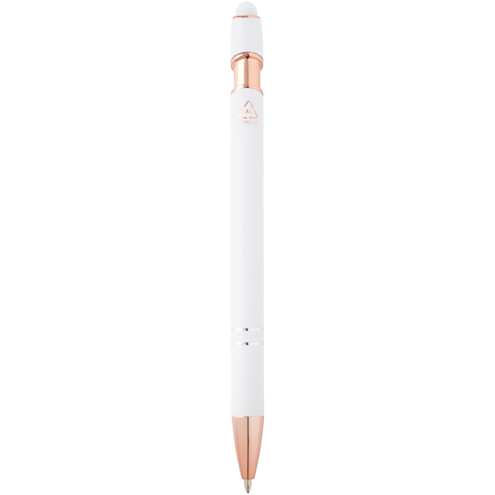 The Nanna ballpoint pen with rose gold finish has a barrel made of recycled aluminium with a touch stylus made of silicone. Recycled aluminium reduces the amount of waste in landfills and helps to conserve natural resources aiming to reduce greenhouse emissions. Ink colour: Black. Writing length: 800 metres. Nib size: 1.0 mm. Dimensions: 14,4 x O 1 cm