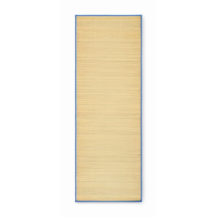 Natural straw roll up beach mat with polyester carry strap. Dimensions: 180 x 60 cm