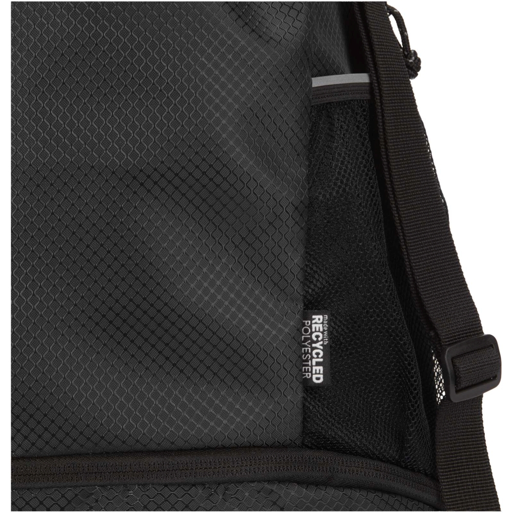 The Nomad sports drawstring bag is made from GRS certified recycled ripstop fabric with a water-repellent finish, GRS certified RPET lining, and reflective elements. It is designed for people with an active lifestyle and is suitable for daily exercise and sports activities. The bag has a spacious main compartment that can hold clothing, a towel, or even a basketball. A separate bottom compartment keeps shoes or used clothes apart from other items. It also includes two side mesh pockets with reflective details, one hidden zipped pocket for valuables, and adjustable webbing shoulder straps for comfortable carrying. Dimensions: 29 x 47 x 12 cm