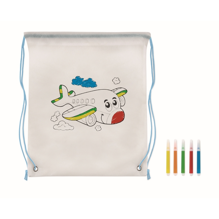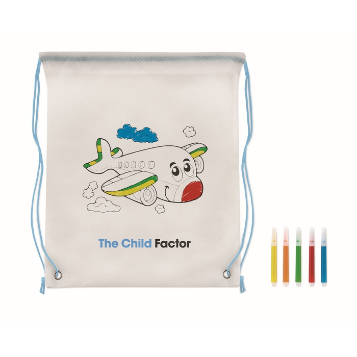 Non woven drawstring bag with 5 markers and design to colour in. 80 gr/m2. Standard imprint. Rozměry: 28 x 35 cm