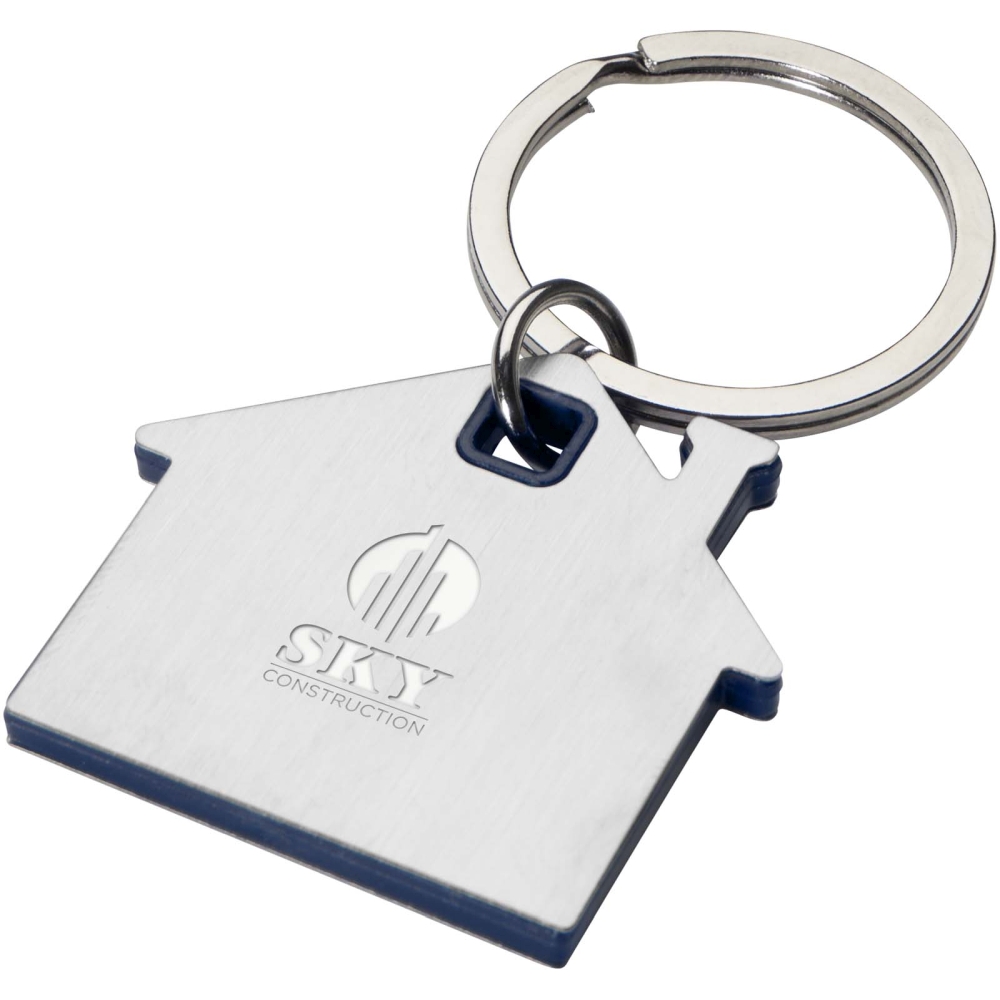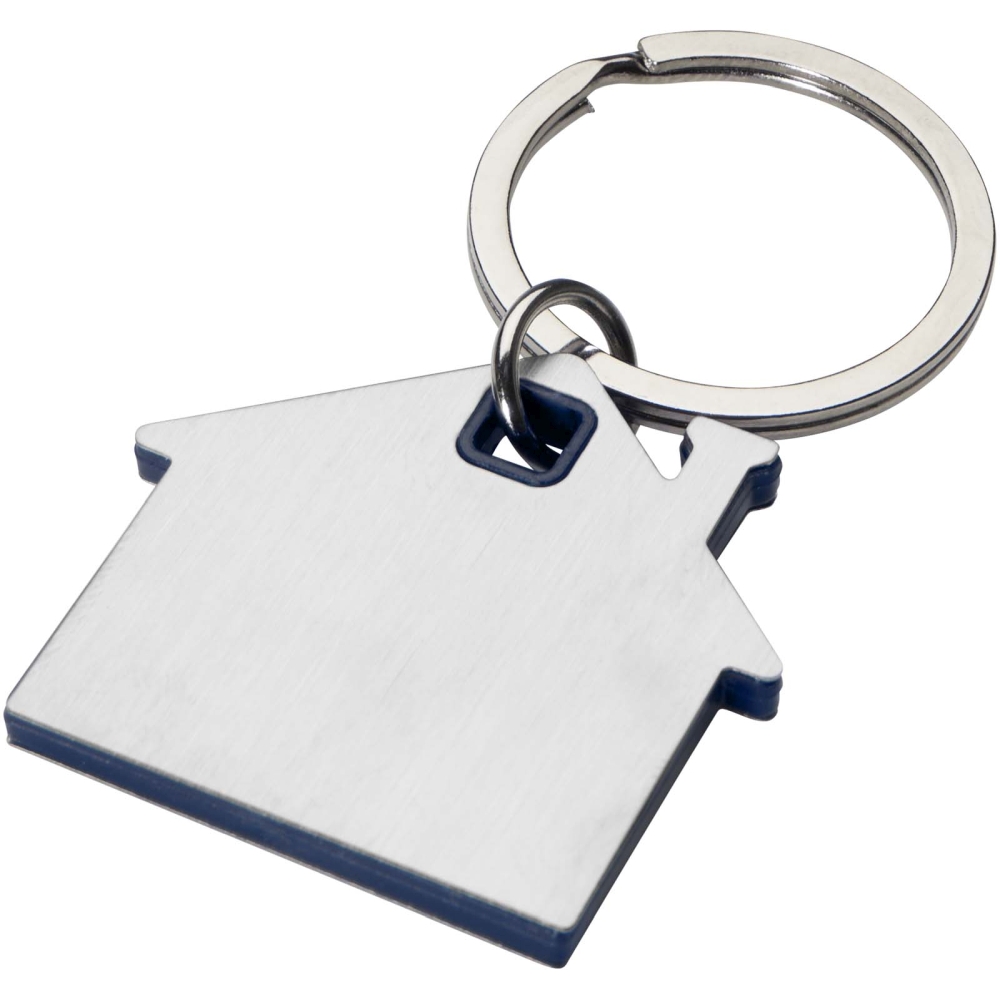House-shaped keychain with a stainless steel plate with a frosted design front and back, and a coloured plastic chip in the middle. Dimensions: 4 x 0,3 x 6 cm