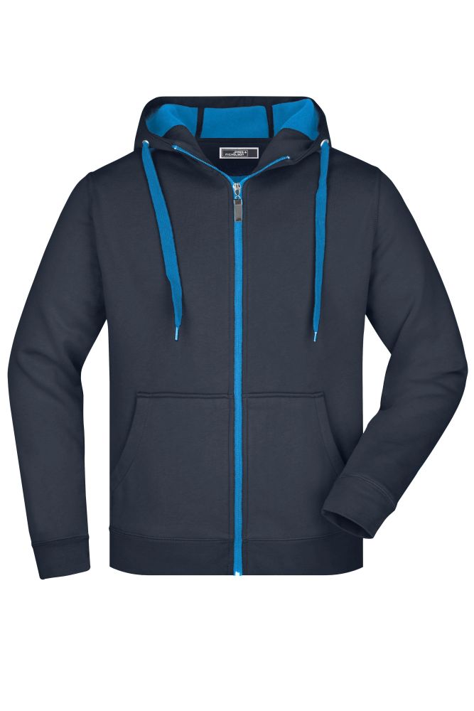 Mens hoodie. Zip, laces and interior in contrasting color. Hood with chin protection. Sleeves and waist with elastane, kangaroo pocket, flat seams.