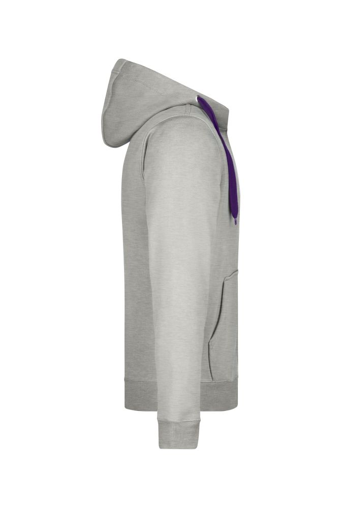 Mens hoodie. Zip, laces and interior in contrasting color. Hood with chin protection. Sleeves and waist with elastane, kangaroo pocket, flat seams.