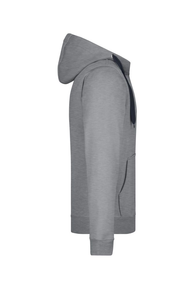 Mens hoodie. Zip, laces and interior in contrasting color. Hood with chin protection. Sleeves and waist with elastane, kangaroo pocket, flat seams.