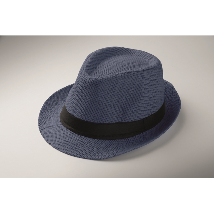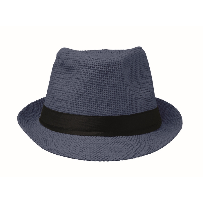 Paper straw hat with black polyester band. For unprinted orders the band will be supplied unattached to the items. Dimensions: O27 x 12 cm
