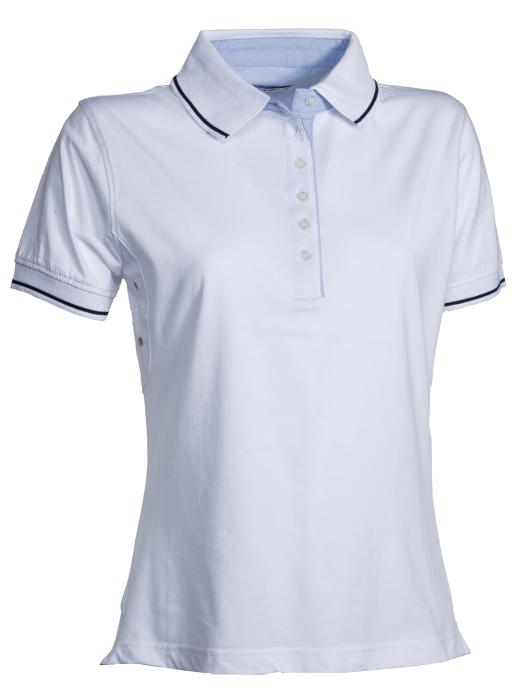 Short sleeve tailoured women’s polo shirt with six white buttons, inside of neck, placket and side vents in Oxford blue, rib collar and sleeve edge with fine contrasting trim, eyelets under the arms. 100% cotton, 175 gsm. Sizes: S-M-L-XL.