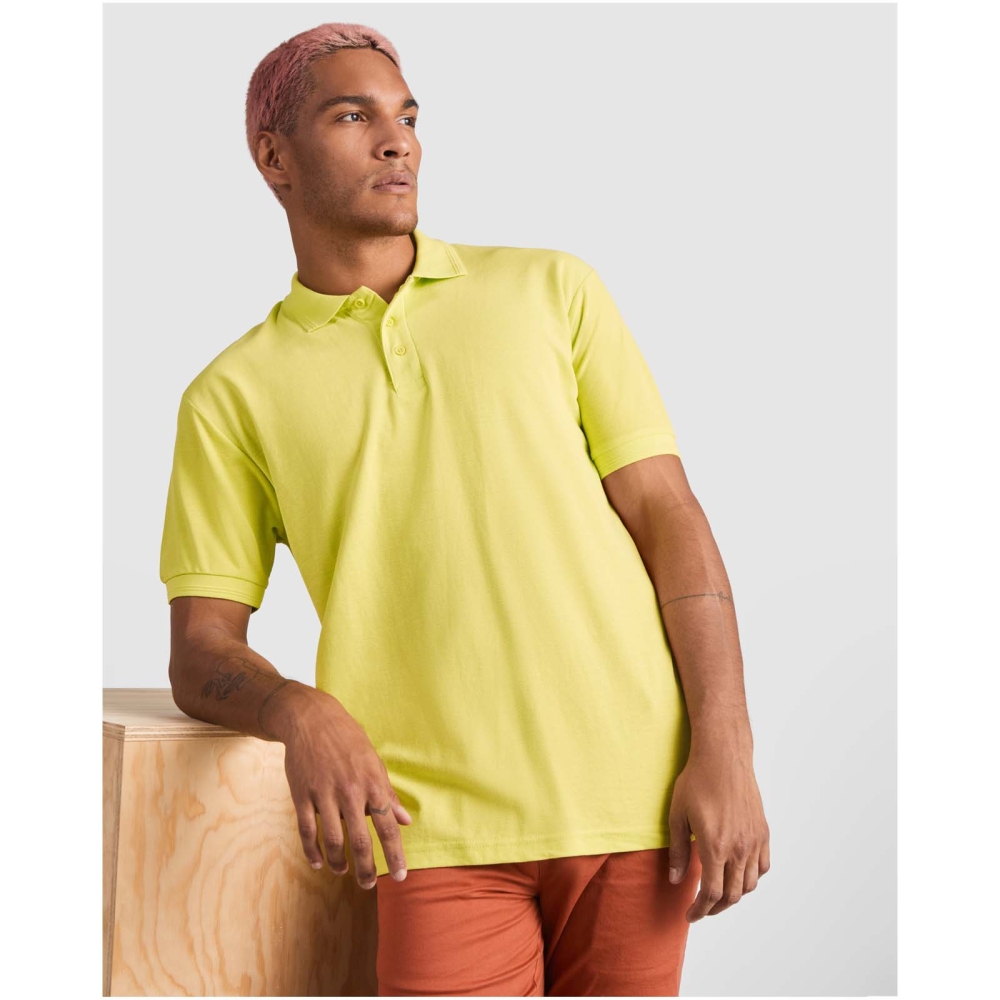 Short-sleeve polo shirt. Collar and sleeves edging in 1x1 ribbed fabric with detail. 3-button placket. Reinforced covered seams in collar. Side slits and optional pocket. Washable at 60 degrees. Removable label. Anti-pilling treatment.