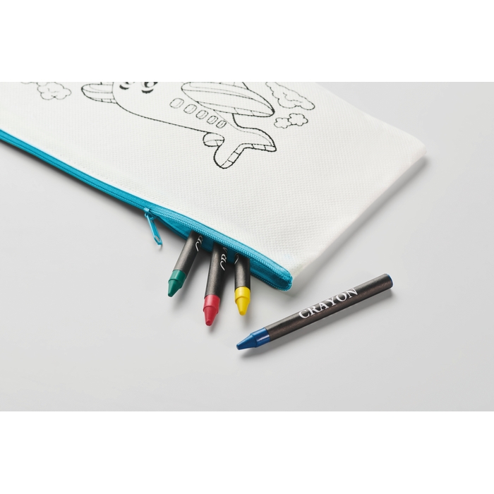 Non woven pencil case including 4 crayons. Dimensions: 23 x 13 cm