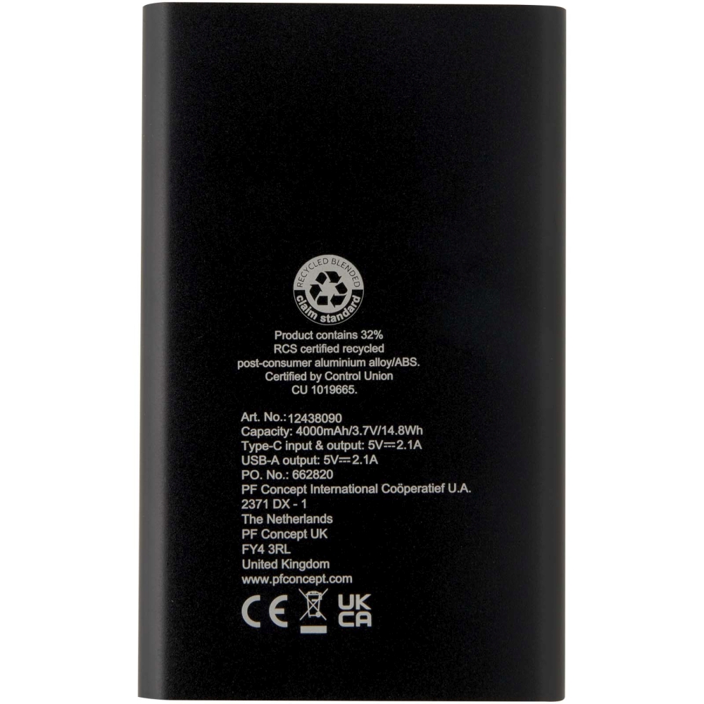Pep 4000 mAh Type-C recycled aluminium power bank, solid black