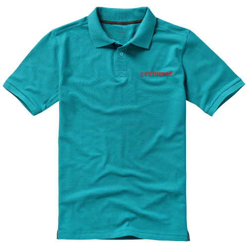Calgary polo. Pre-shrunk. 1x1 rib collar and cuffs. Satin neck tape. Side slit with satin tape on inside. Forwarded shoulder seam with chain stitching. Tonal logo print at back. Mens and Kids 2 button placket with engraved buttons. Ladies 3 button placket with engraved buttons. Corporate yet casual polo. Pick-Stitch details. Pique knit, 100% Cotton. 200 gsm