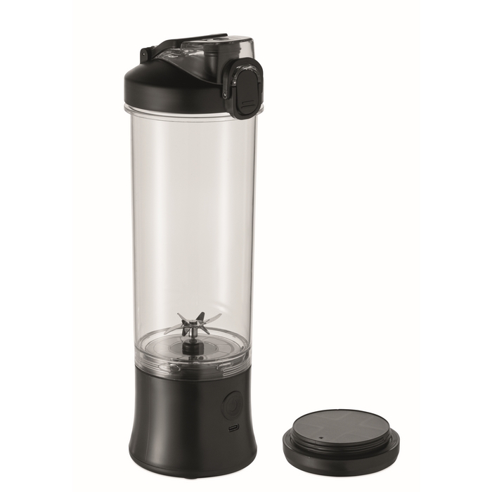 Portable blender cup in PCTG with PP lid, extra drink lid and carry loop. Features 18000 rpm motor, 1200 mAh rechargeable battery, and Type-C to USB-A cable. Capacity: 600ml. Dimensions: O9 x 28 cm(E x TRALID:O7.5 x 2.2 cm)