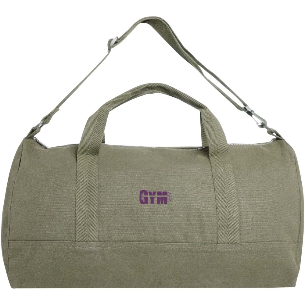 The Porter duffel bag made of 500 g/m2 recycled cotton and recycled polyester comes with a spacious main compartment for optimal storage of larger items and a small front slip pocket to store small items such as a passport or phone. The duffel can be carried by the 2 short handles, or by the expandable and detachable shoulder strap that can be adjusted for maximum comfort. The duffel bag incorporates Cyclo® recycled fibres where they use pre-sorted waste that determines the colour of the yarn. These fibres do not only reduce the demand for virgin resources but also exhibit a commitment to a circular life, embodying the essence of reducing waste and promoting a closed-loop system. Each bag also comes with an Aware™ tracer. This innovative feature allows users to trace the origins and journey of their item through a QR code, enhancing transparency in the supply chain and fostering a stronger connection between the product and its production process. Volume capacity: 50 litres. Dimensions: 55 x 30 x 30 cm