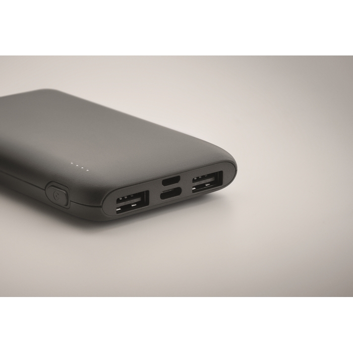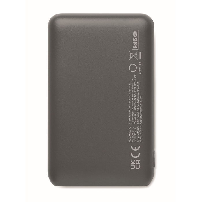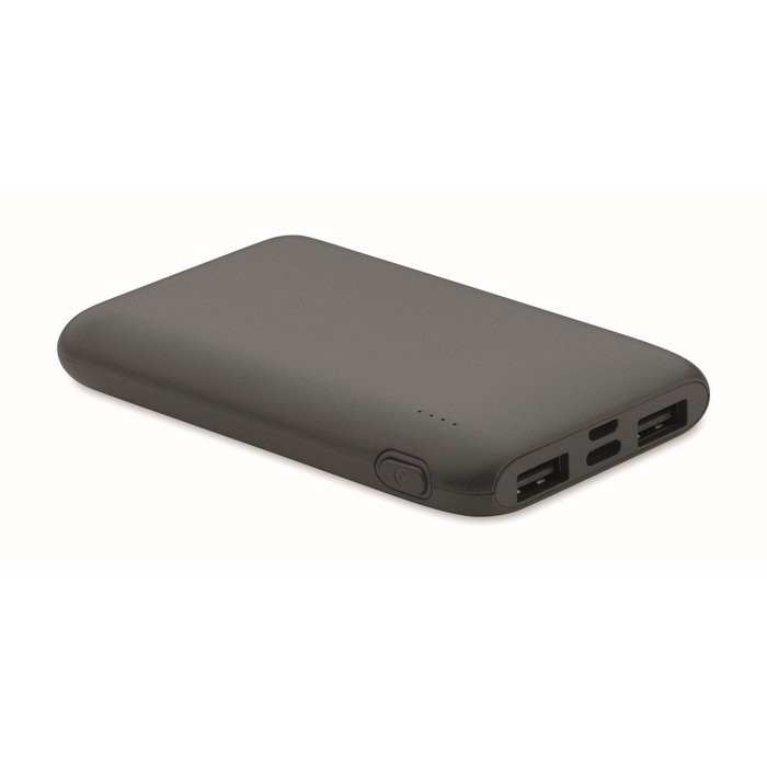 Power bank 5000 mAh in recycled ABS. Capacity for smartphone use, Output: 1 x Type-C, 2 x Type-A & 1 x Type-B. Input: 2-in-1 Type C & Type-A. Dimensions: 9,9 x 6,2 x 1,5 cm