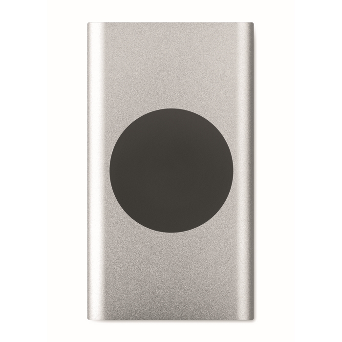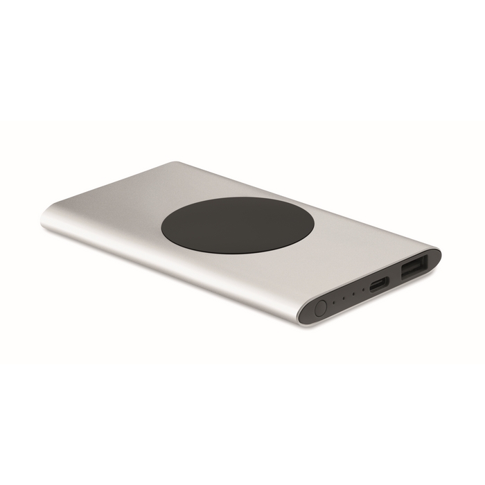 Wireless 15W charging 5000 mAh power bank in recycled aluminium. Input: Type-C. Output: 1 x Type-C & 1 x Type-A. Dimensions: 12 x 6,5 x 0,9 cm