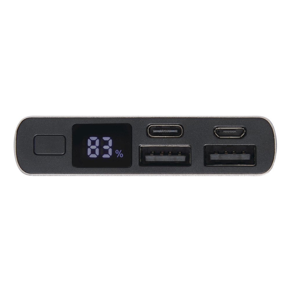 Powerbank suitable for smartphones and USB-connected devices, incl. USB charging cable with USB Type-C connector (length: approx. 30 cm), with battery level indicator in percentage, power on/off switch, 1 USB Type-C input/output, 1 Micro-USB input, 2 USB Type-A outputs, input: 5V/2A, output: 5V/2A (max.), capacity: 10.000 mAh, high-performance lithium battery, packed in a gift box. Dimensions: 14,2 x 6,6 x 1,6 cm
