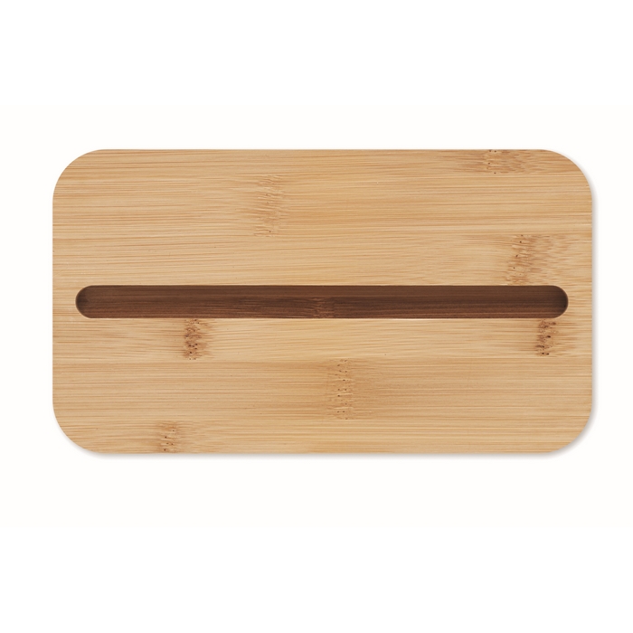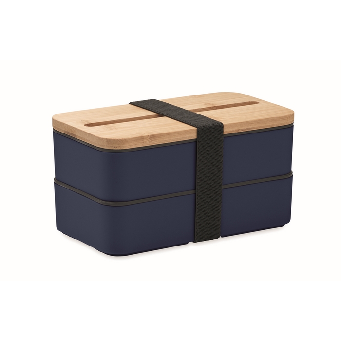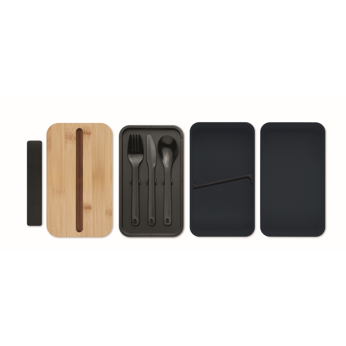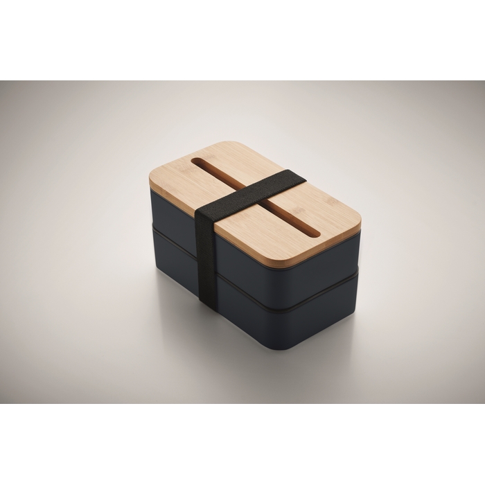 PP two-tier lunch box with removable divider and 3 cutlery utensils with attachable polyester band with bamboo lid. The lid has a phone stand functionality. Capacity: 400 ml (2x). Bamboo is a natural product, there may be slight variations in colour and size per item, which can affect the final decoration outcome. Dimensions: 18 x 10 x 9,5 cm