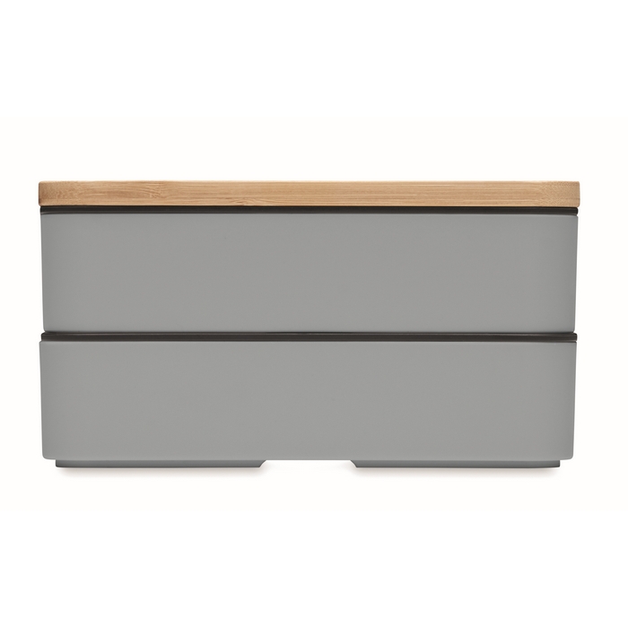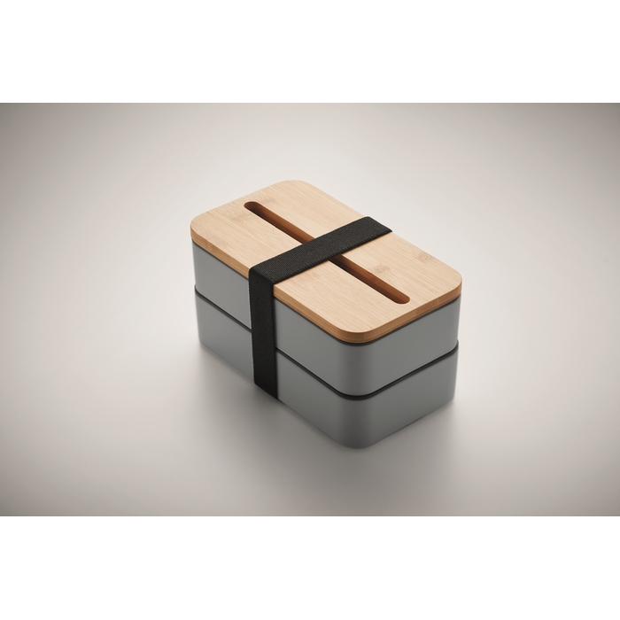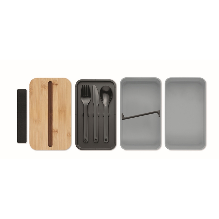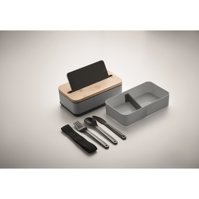 PP two-tier lunch box with removable divider and 3 cutlery utensils with attachable polyester band with bamboo lid. The lid has a phone stand functionality. Capacity: 400 ml (2x). Bamboo is a natural product, there may be slight variations in colour and size per item, which can affect the final decoration outcome. Dimensions: 18 x 10 x 9,5 cm