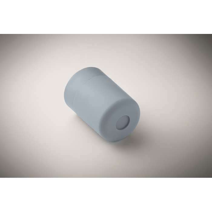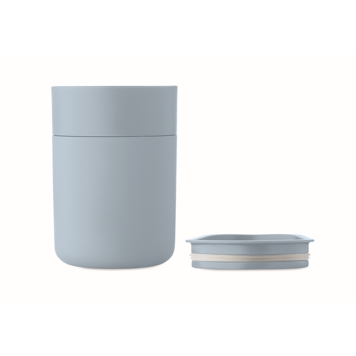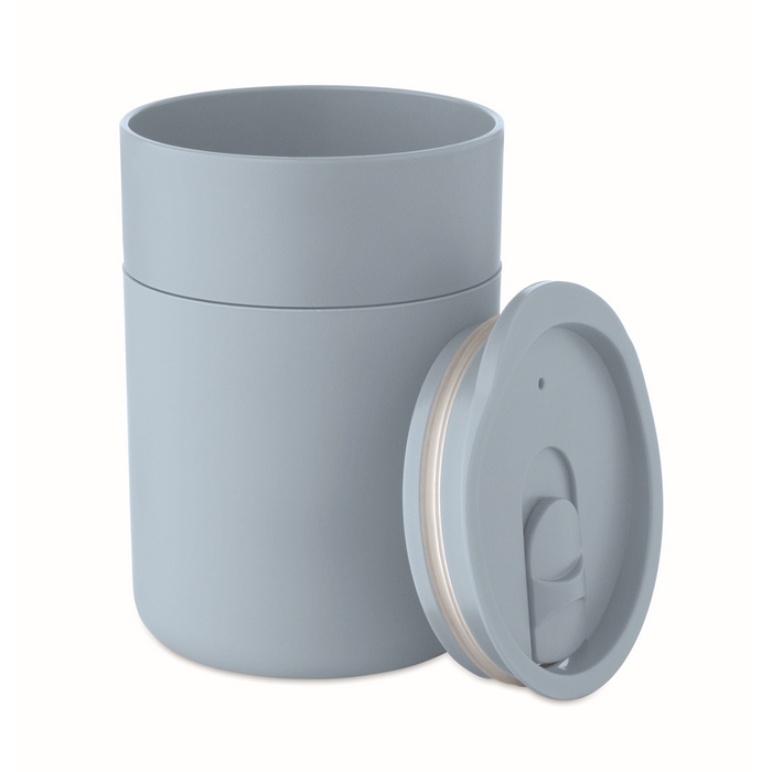 PP tumbler with silicone sleeve and PP sliding lid. Capacity: 330 ml. As this is a single walled mug, heat transfer can still occur. Dimensions: 8.4 x 7.9 x 11.3 cm