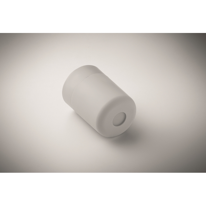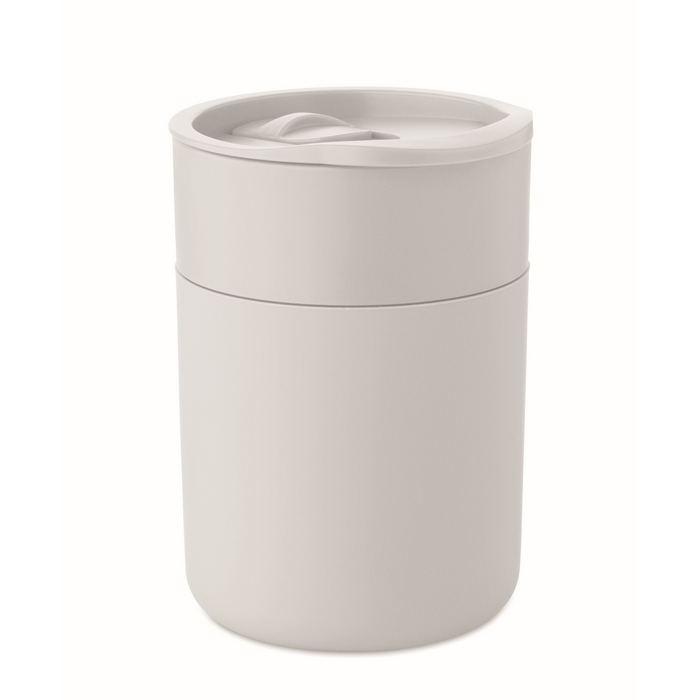 PP tumbler with silicone sleeve and PP sliding lid. Capacity: 330 ml. As this is a single walled mug, heat transfer can still occur. Dimensions: 8.4 x 7.9 x 11.3 cm