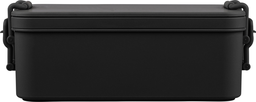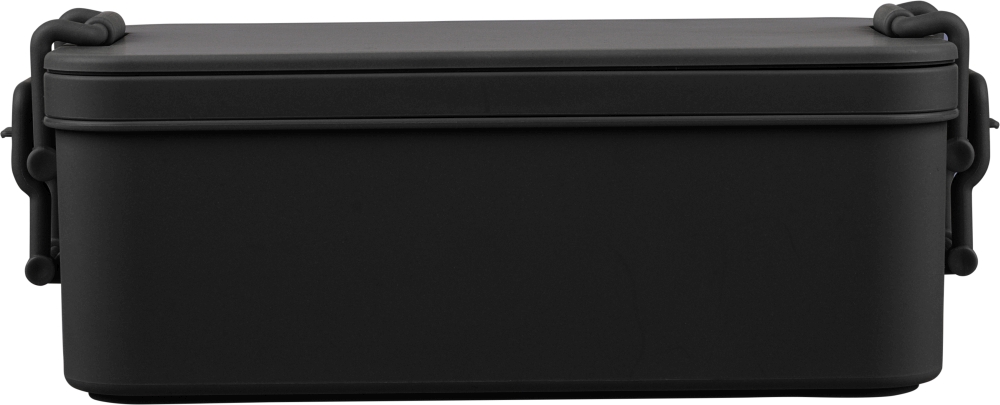 PP two-layer lunchbox with clip closure and PP lid. Features a smaller bottom compartment that stacks into the top to save space. Includes intermediate layer with 3-piece cutlery set. 2,200 ml capacity. Packed in bulk. Dimensions: 7,7 cm x 23 cm