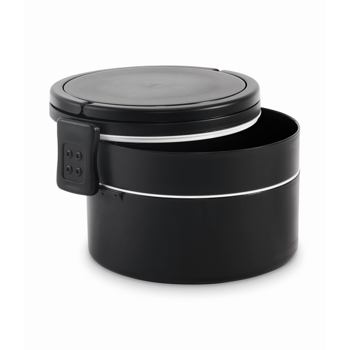 Two-tier round lunch box made of PP with side clip closure and handles. Includes inner lids. Capacity 250 ml top, 700 ml bottom. Rozměry: 16.5 x 14.5 x 11.3 cm