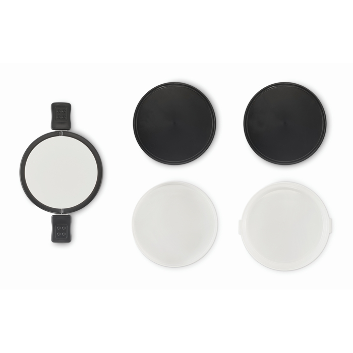 Two-tier round lunch box made of PP with side clip closure and handles. Includes inner lids. Capacity 250 ml top, 700 ml bottom. Rozměry: 16.5 x 14.5 x 11.3 cm