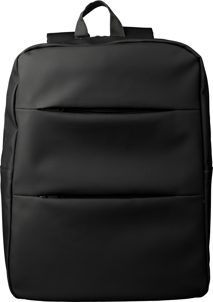 PU laptop backpack (15 inch) with two zippered front pockets, a large zippered compartment with a Velcro-closed laptop section, and multiple inserts inside. Ventilated padded backside with trolley strap and adjustable shoulder straps. Water repellent. Dimensions: 12,5 cm x 30 cm