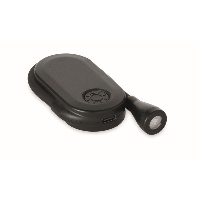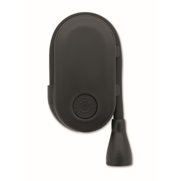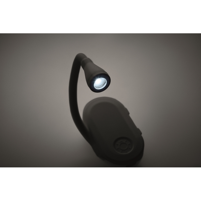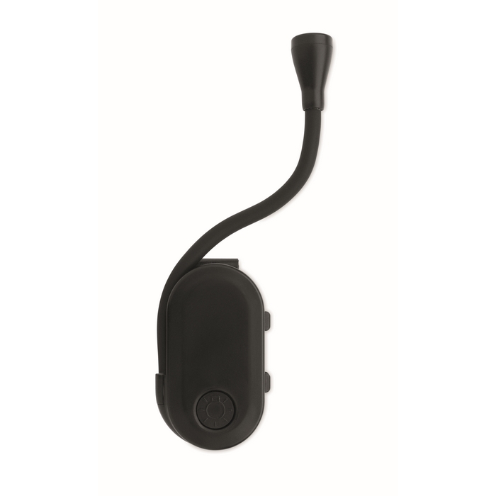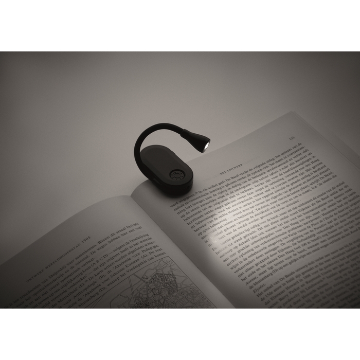 Rechargeable LED book light in ABS with flexible body and clip. Features 3 light settings, 300mAh battery. Dimensions: 8.3 x 4.6 x 1.8 cm