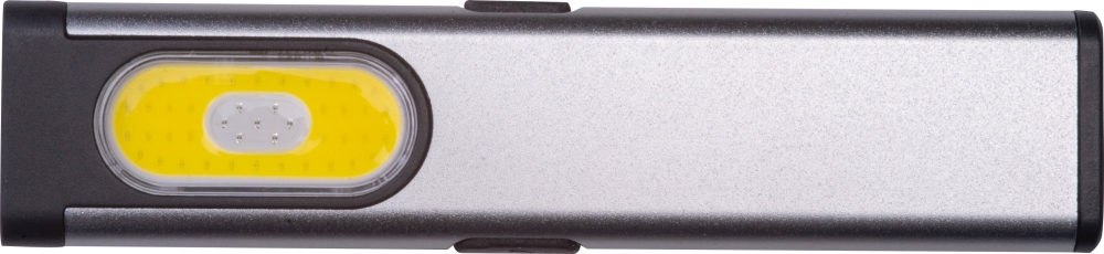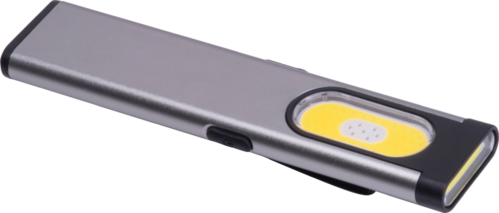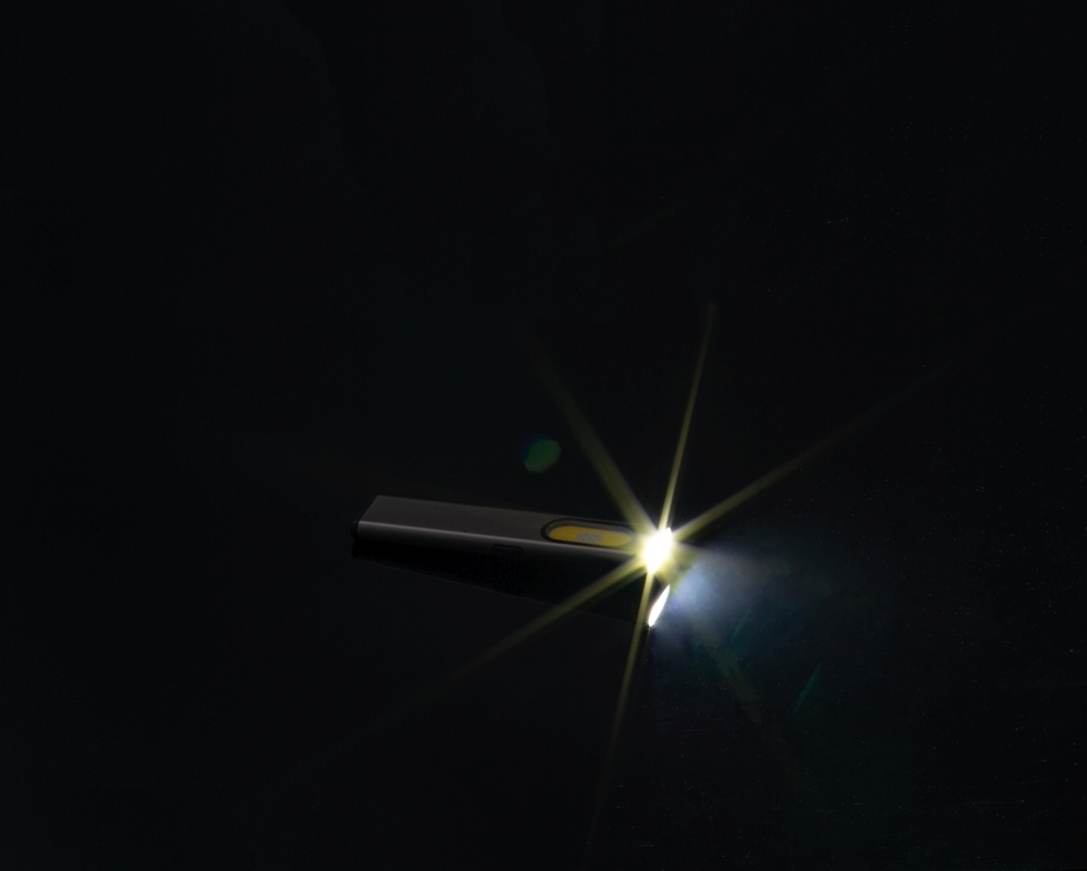 Rechargeable flashlight (450 mAh) made of recycled aluminum with side COB light (160 lumens) and front light (80 lumens), clip, and magnetic end. Includes charging cable. Dimensions: 11 x 2,5 x 0,8 cm