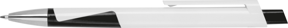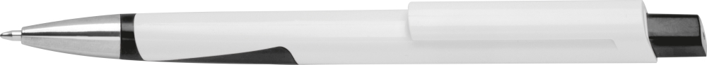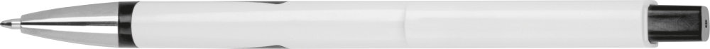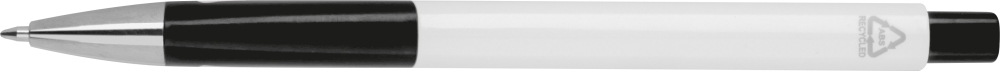 White ballpoint pen made from recycled plastic (RABS) with blue ink refill. Dimensions: 14,5 x 1,1 x 1 cm