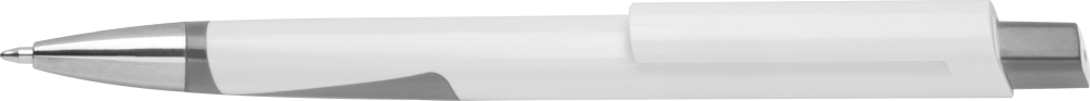 White ballpoint pen made from recycled plastic (RABS) with blue ink refill. Dimensions: 14,5 x 1,1 x 1 cm