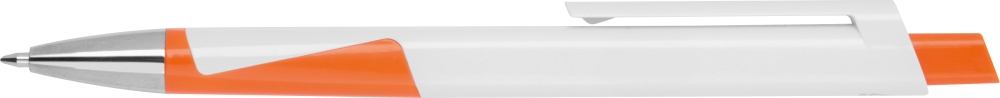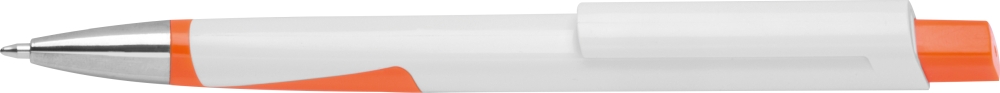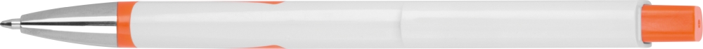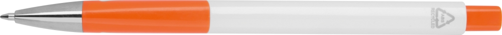 White ballpoint pen made from recycled plastic (RABS) with blue ink refill. Dimensions: 14,5 x 1,1 x 1 cm