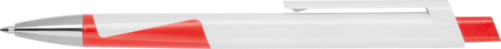 White ballpoint pen made from recycled plastic (RABS) with blue ink refill. Dimensions: 14,5 x 1,1 x 1 cm