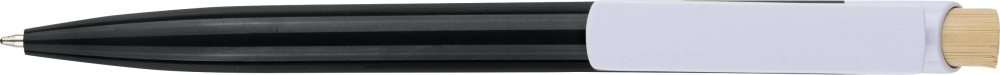 Recycled ABS ballpen with bamboo push button and white clip, suitable for digital printing. Features a recycled logo in the in-mould. Approximate writing length of 600 metres. Blue ink. Dimensions: 1 cm x 1,4 cm x 14,4 cm