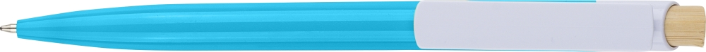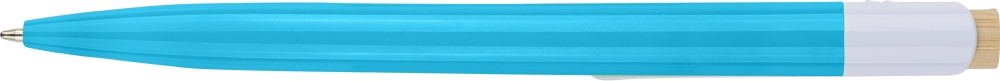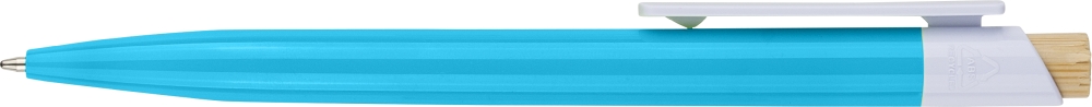 Recycled ABS ballpen with bamboo push button and white clip, suitable for digital printing. Features a recycled logo in the in-mould. Approximate writing length of 600 metres. Blue ink. Dimensions: 1 cm x 1,4 cm x 14,4 cm