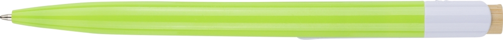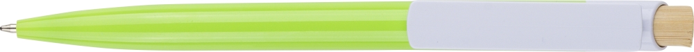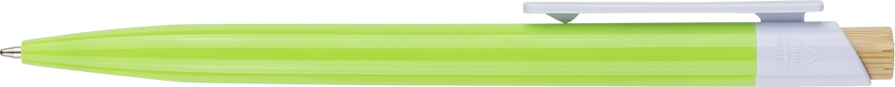 Recycled ABS ballpen with bamboo push button and white clip, suitable for digital printing. Features a recycled logo in the in-mould. Approximate writing length of 600 metres. Blue ink. Dimensions: 1 cm x 1,4 cm x 14,4 cm