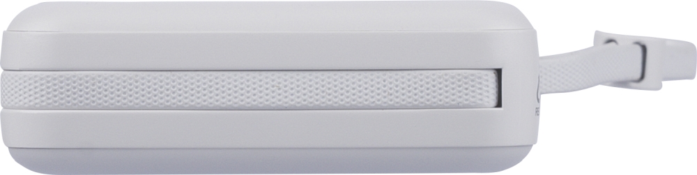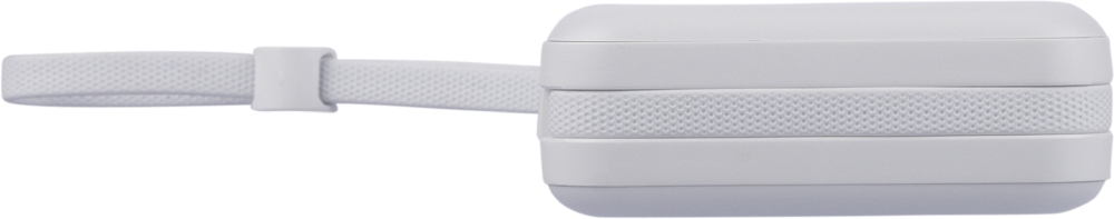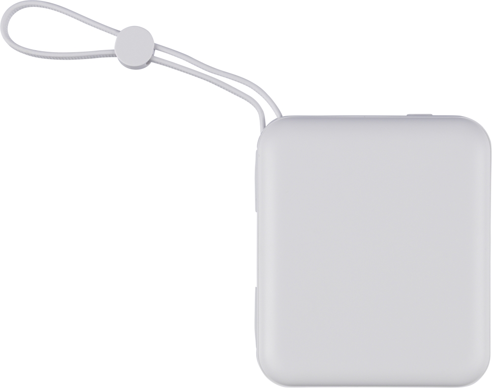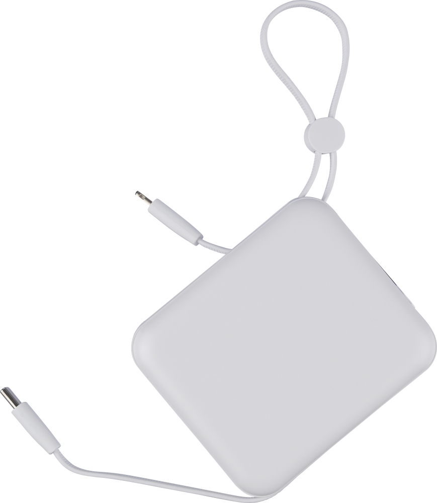 Recycled ABS powerbank with 10,000 mAh Li-ion battery and 22.5W fast charging. Integrated TPE cable with Lightning and Type-C connectors. LED battery display, Type-C in/out, Type-A input. Safety protections included. Recycled ABS logo on back. Packed in brown cardboard box with tissue paper. Dimensions: 2,41 cm x 7,51 cm
