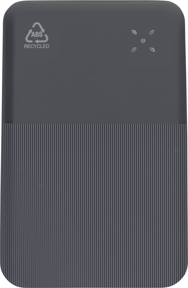 Recycled ABS powerbank (10,000 mAh). 22.5W fast charging. Type-C in/out, Type-A input. Digital display, smooth/textured design. Safety protections. Recycled ABS logo on back. Packed in brown box with tissue paper. Dimensions: 1,53 cm x 10,8 cm