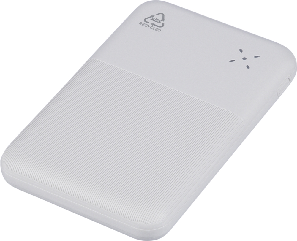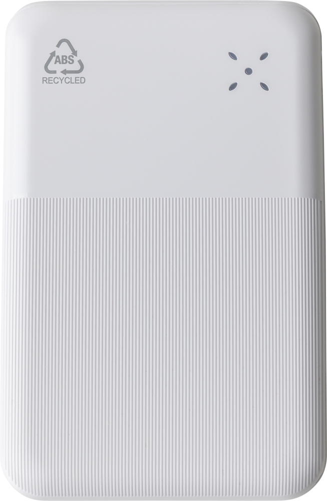 Recycled ABS powerbank (10,000 mAh). 22.5W fast charging. Type-C in/out, Type-A input. Digital display, smooth/textured design. Safety protections. Recycled ABS logo on back. Packed in brown box with tissue paper. Dimensions: 1,53 cm x 10,8 cm