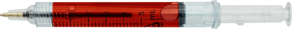 Ballpen designed in the shape of a syringe, filled with colored liquid for a playful and eye-catching look. Made with recycled ABS, reducing plastic waste while maintaining strong impact resistance and long-lasting durability. Equipped with a black writing refill and push mechanism. Includes a stylus tip for use on capacitive touchscreens. Finished with an inmould recycled ABS logo. Dimensions: 1,2 x 2 x 12,9 cm