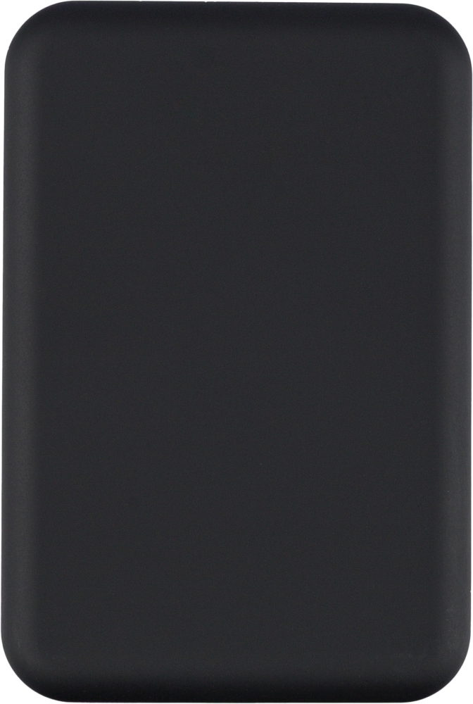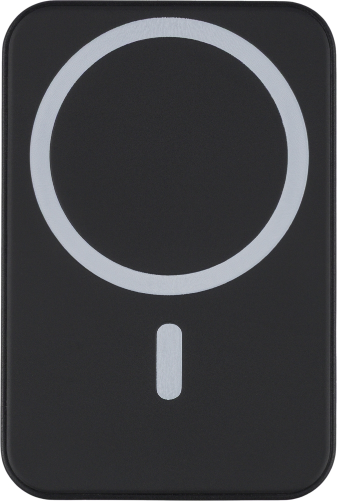 Recycled ABS wireless charger powerbank (5,000 mAh). 15W MagSafe-compatible wireless charging. Type-C in/out, safety protections, auto shut-off. Includes metal ring for non-MagSafe. Recycled ABS logo on side. Packed in brown box with tissue paper. Dimensions: 1,5 cm x 9,7 cm