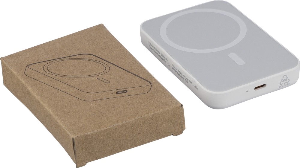 Recycled ABS wireless charger powerbank (5,000 mAh). 15W MagSafe-compatible wireless charging. Type-C in/out, safety protections, auto shut-off. Includes metal ring for non-MagSafe. Recycled ABS logo on side. Packed in brown box with tissue paper. Dimensions: 1,5 cm x 9,7 cm