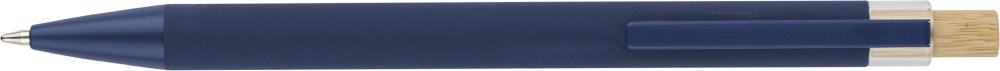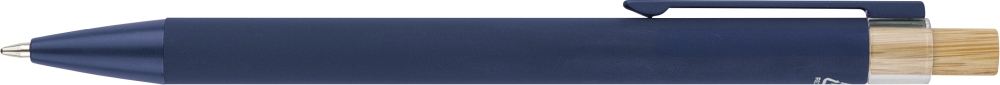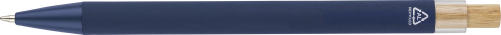 Recycled aluminium ballpen with bamboo push button featuring an AS plastic detail. Includes a metal clip and plastic tip, both in matching colors. Laser-engraved recycled logo on the barrel. Approximate writing length of 800 metres. Blue ink. Dimensions: 1 cm x 1,25 cm x 14 cm