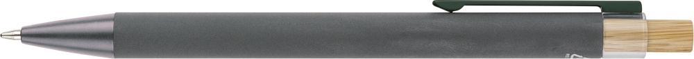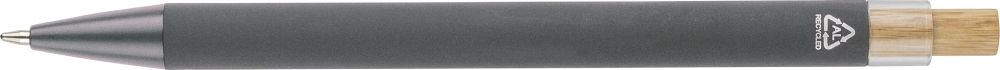 Recycled aluminium ballpen with bamboo push button featuring an AS plastic detail. Includes a metal clip and plastic tip, both in matching colors. Laser-engraved recycled logo on the barrel. Approximate writing length of 800 metres. Blue ink. Dimensions: 1 cm x 1,25 cm x 14 cm