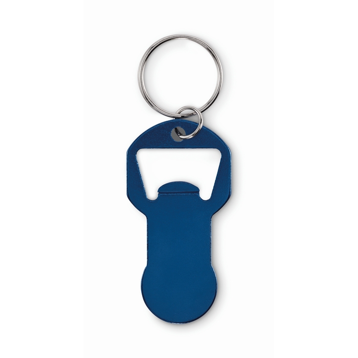 Bottle opener token keyring made of recycled aluminium with iron ring. Dimensions: 6.1 x 3.1 x 0.22 cm