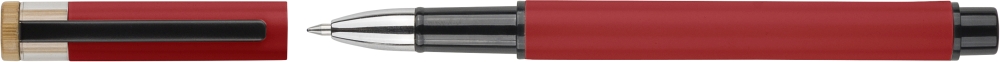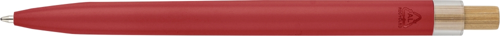 Recycled aluminium lacquered pen set with ballpen and roller pen. Features bamboo pusher, rPET trim, and metal clip; roller pen includes bamboo/rPET cap detail and matching clip. Both with engraved recycled logo. Writes approx. 700 m (ballpen) and 500 m (roller pen). Blue ink. Packed in colored recycled cardboard gift box. Dimensions: 1,4 cm x 17,8 cm
