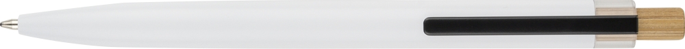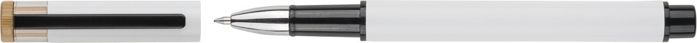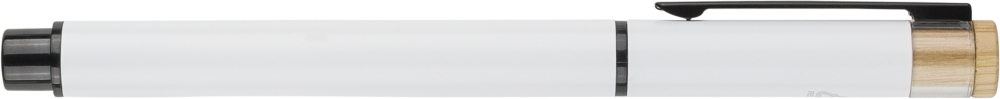 Recycled aluminium lacquered pen set with ballpen and roller pen. Features bamboo pusher, rPET trim, and metal clip; roller pen includes bamboo/rPET cap detail and matching clip. Both with engraved recycled logo. Writes approx. 700 m (ballpen) and 500 m (roller pen). Blue ink. Packed in colored recycled cardboard gift box. Dimensions: 1,4 cm x 17,8 cm