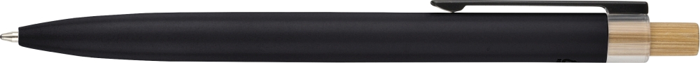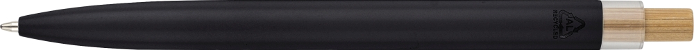 Recycled aluminium lacquered push ballpen with bamboo pusher, rPET trim, and metal clip. Features an engraved recycled logo. Approximate writing length of 700 metres. Blue ink. Dimensions: 1 cm x 14 cm x 1,34 cm